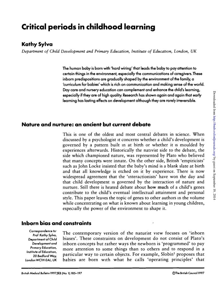 The critical period is discussed in the literature of the early researchers as if there was one critical period for all aspects of language. However, a variety of ages is reported for the on and offset of the critical period, the onset ranging from 6 months to 2 years of age; the offset ranging birth to puberty. Molfese finds support in the writing of Seilger, who suggests that there are different critical periods for such The Critical Period Hypothesis of Language Acquisition Essay The Critical Period Hypothesis For Language Acquisition. The Critical Period Hypothesis for language acquisition was Critical Evidence: A Test of the Critical-Period Hypothesis for Second-Language Acquisition. Research Article Dec 07, · Cameron and Democrat identify fetal life, infancy, childhood, and adolescence as the critical growth periods. Each of these stages involves different aspects of human growth and development. Environmental affects during these stages are necessary In order to allow for proper growth but can also have a deleterious effect on growth and development which can influence Complex Estimated Reading Time: 12 mins